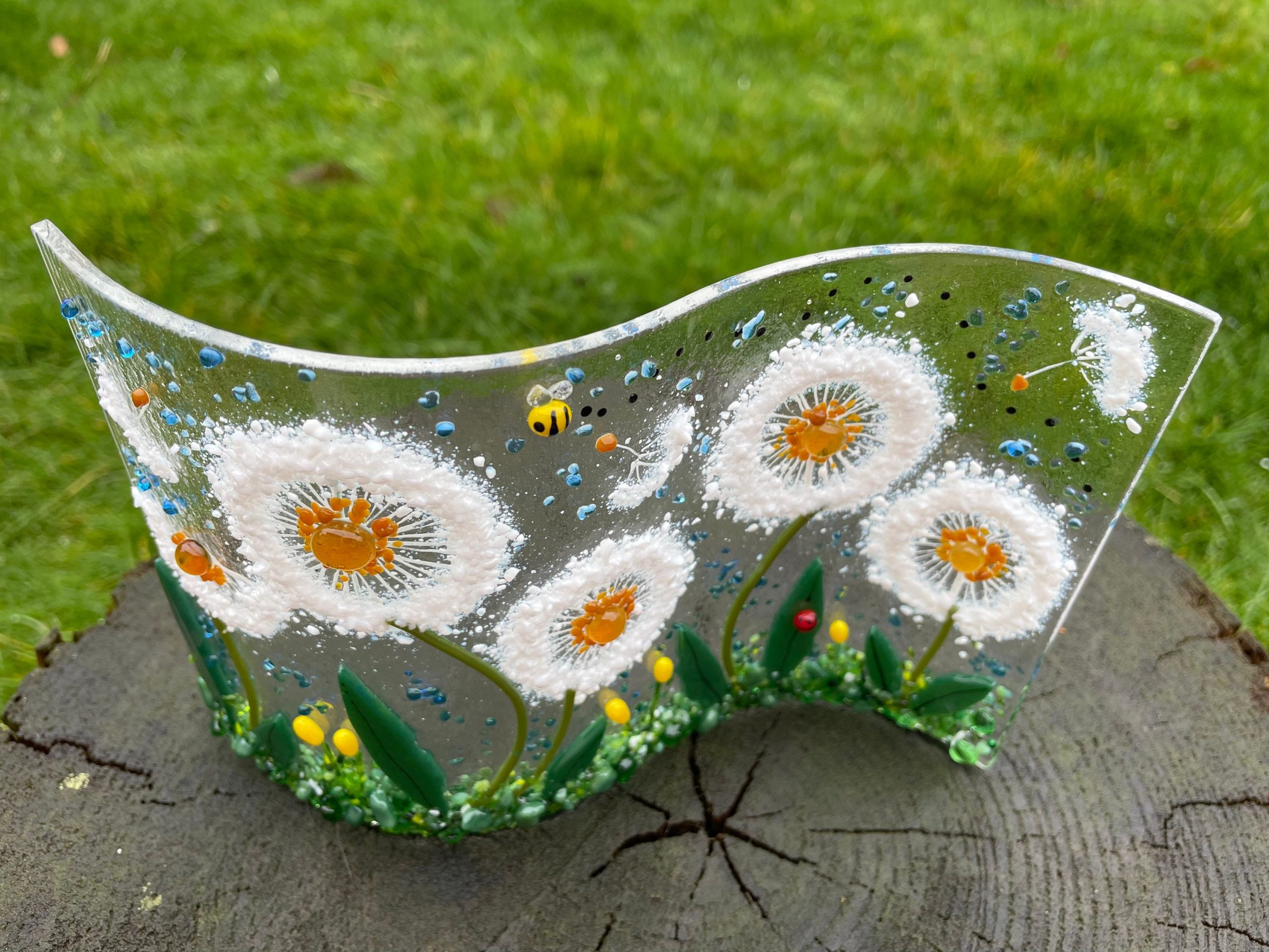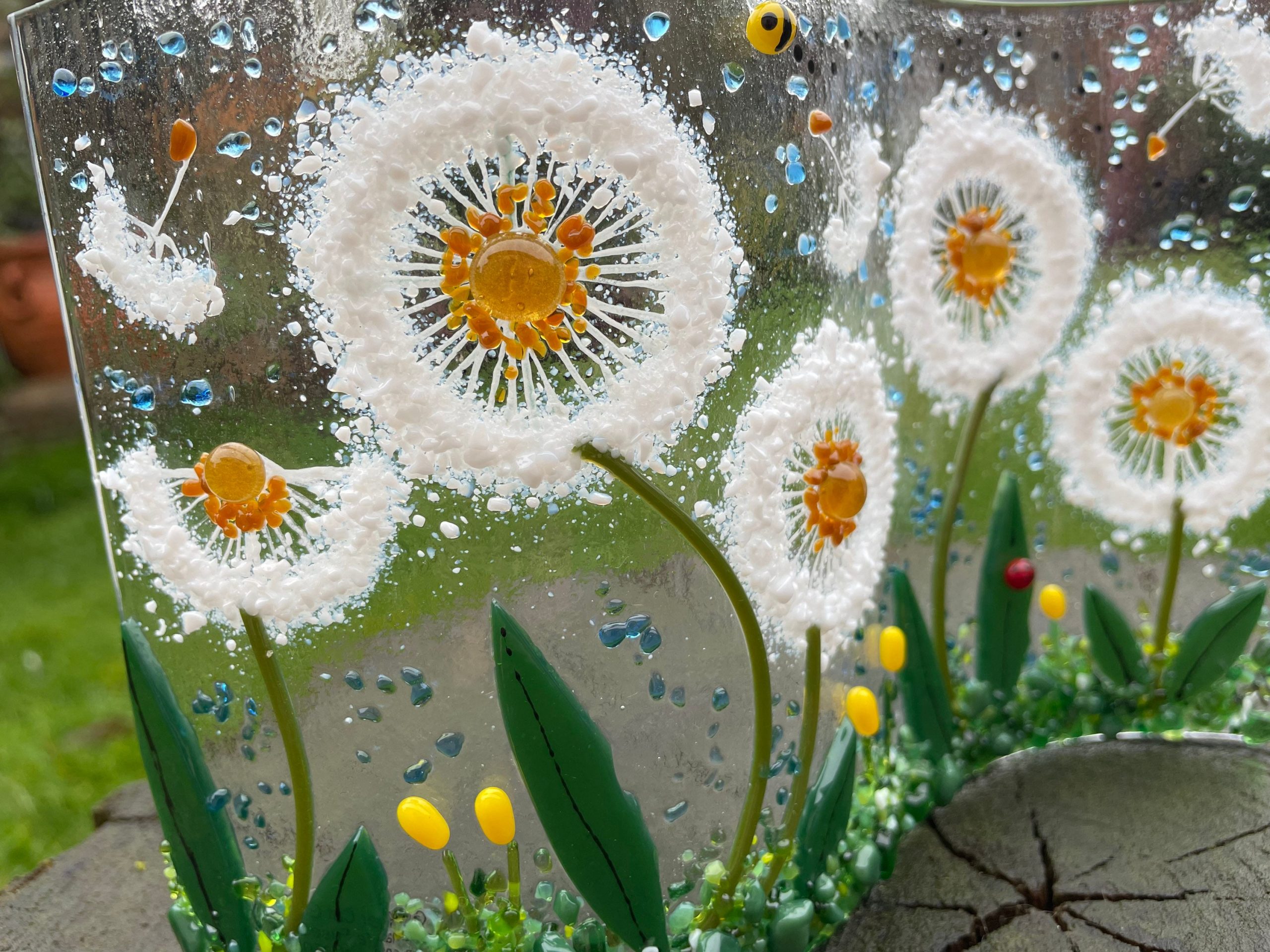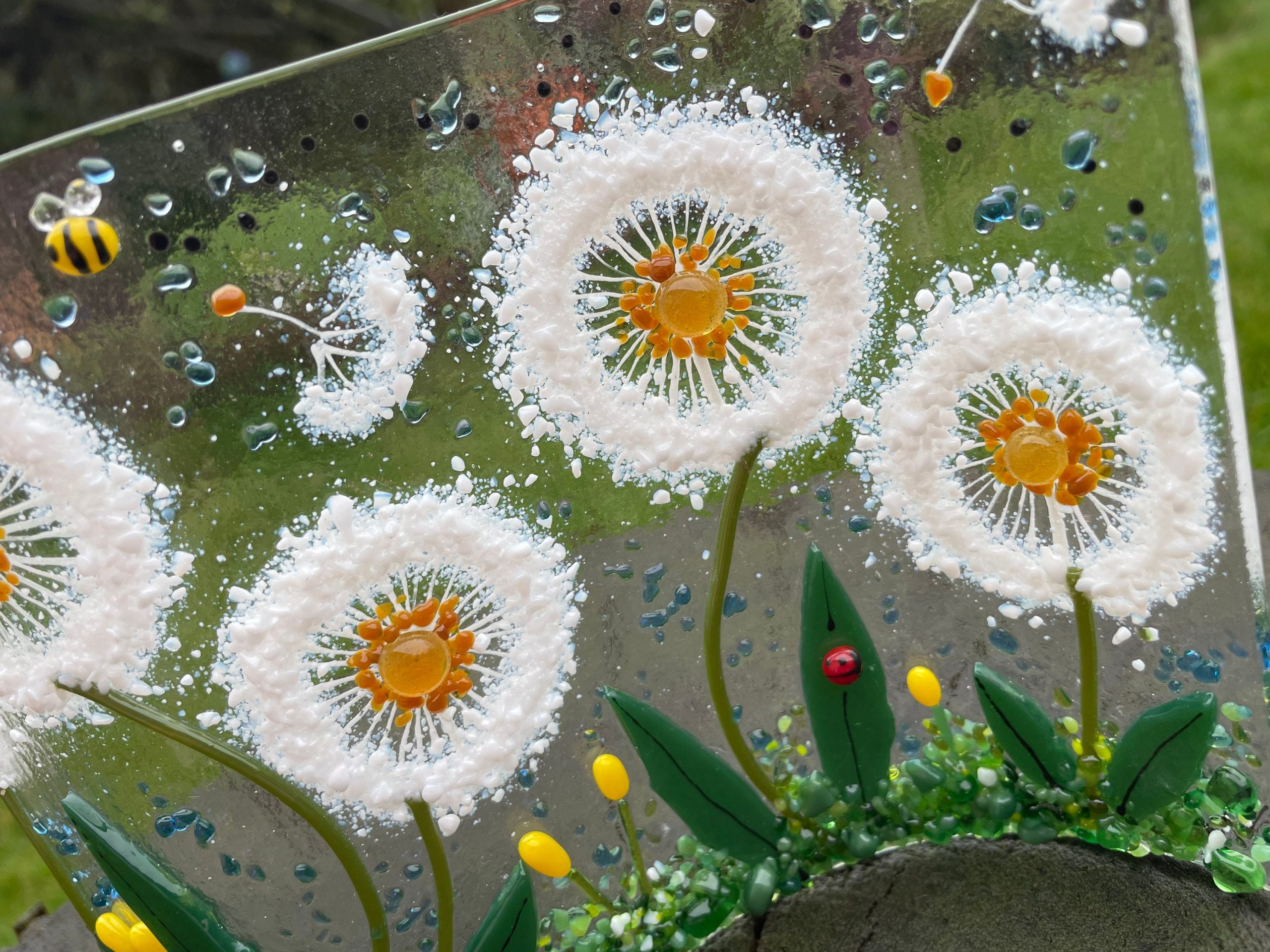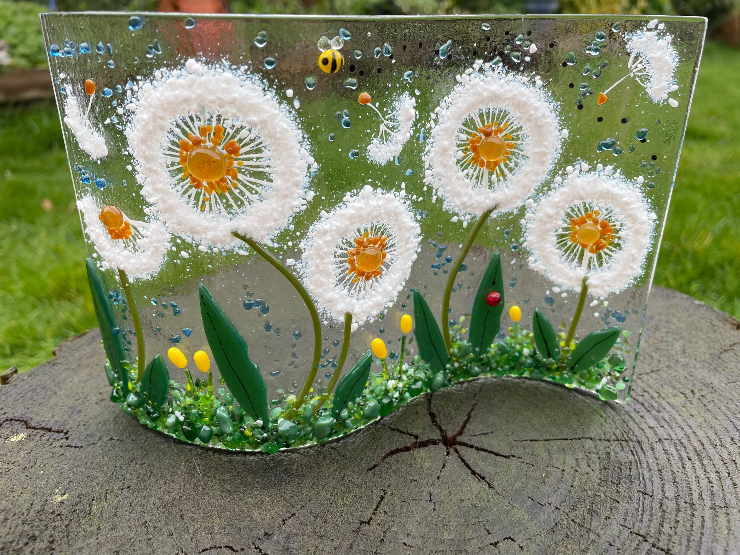 This beautiful handmade fused glass dandelion seed head wave is simple but effective. Made using glass enamel paint, glass frit and sheet glass to produce a beautiful garden scene.