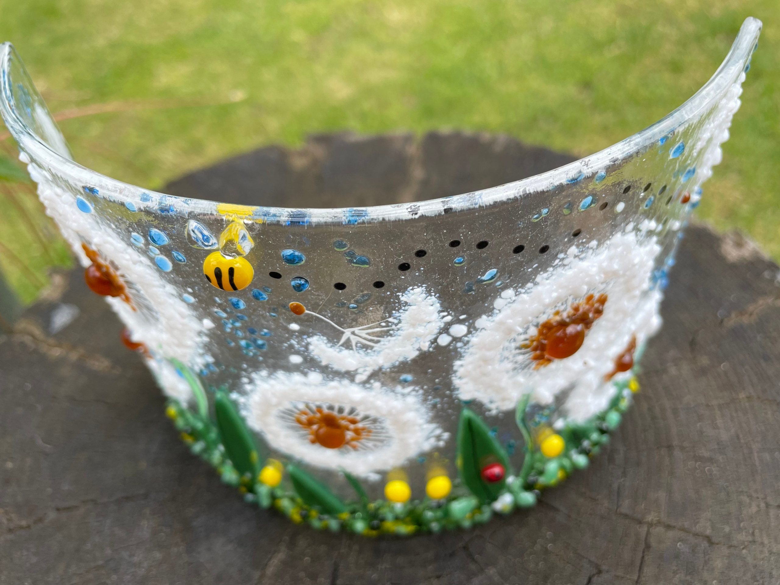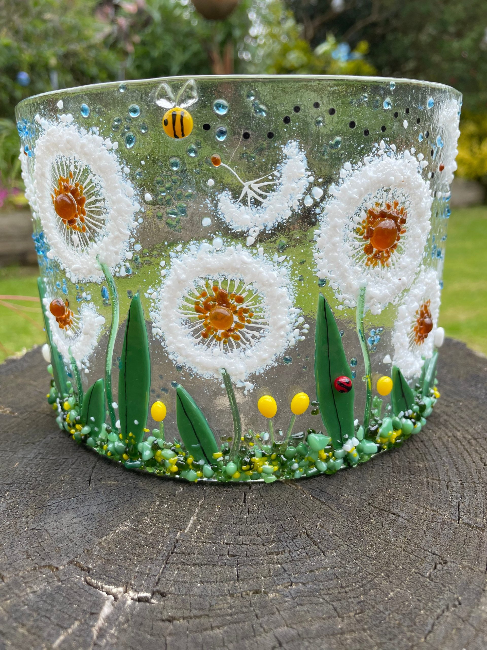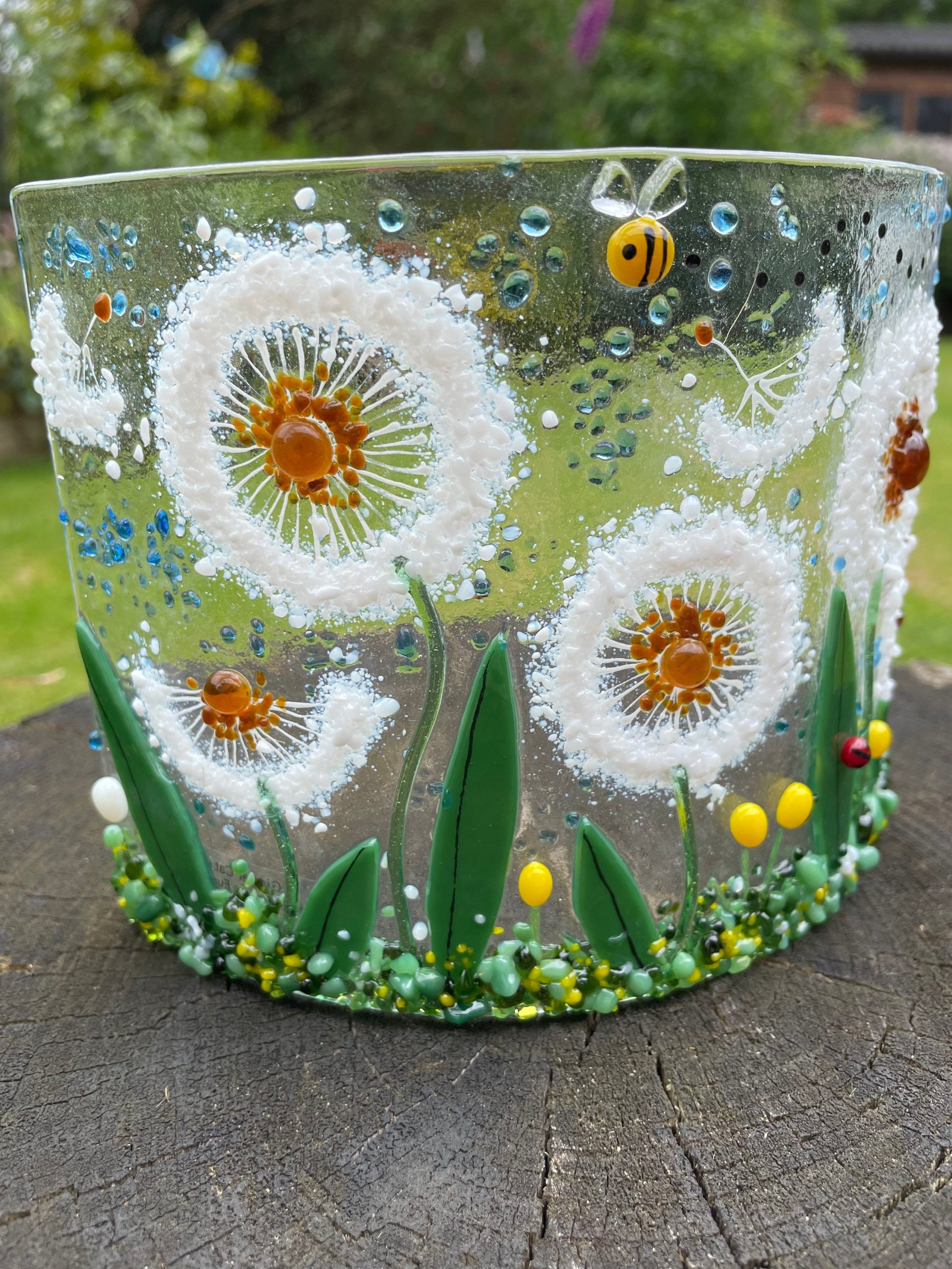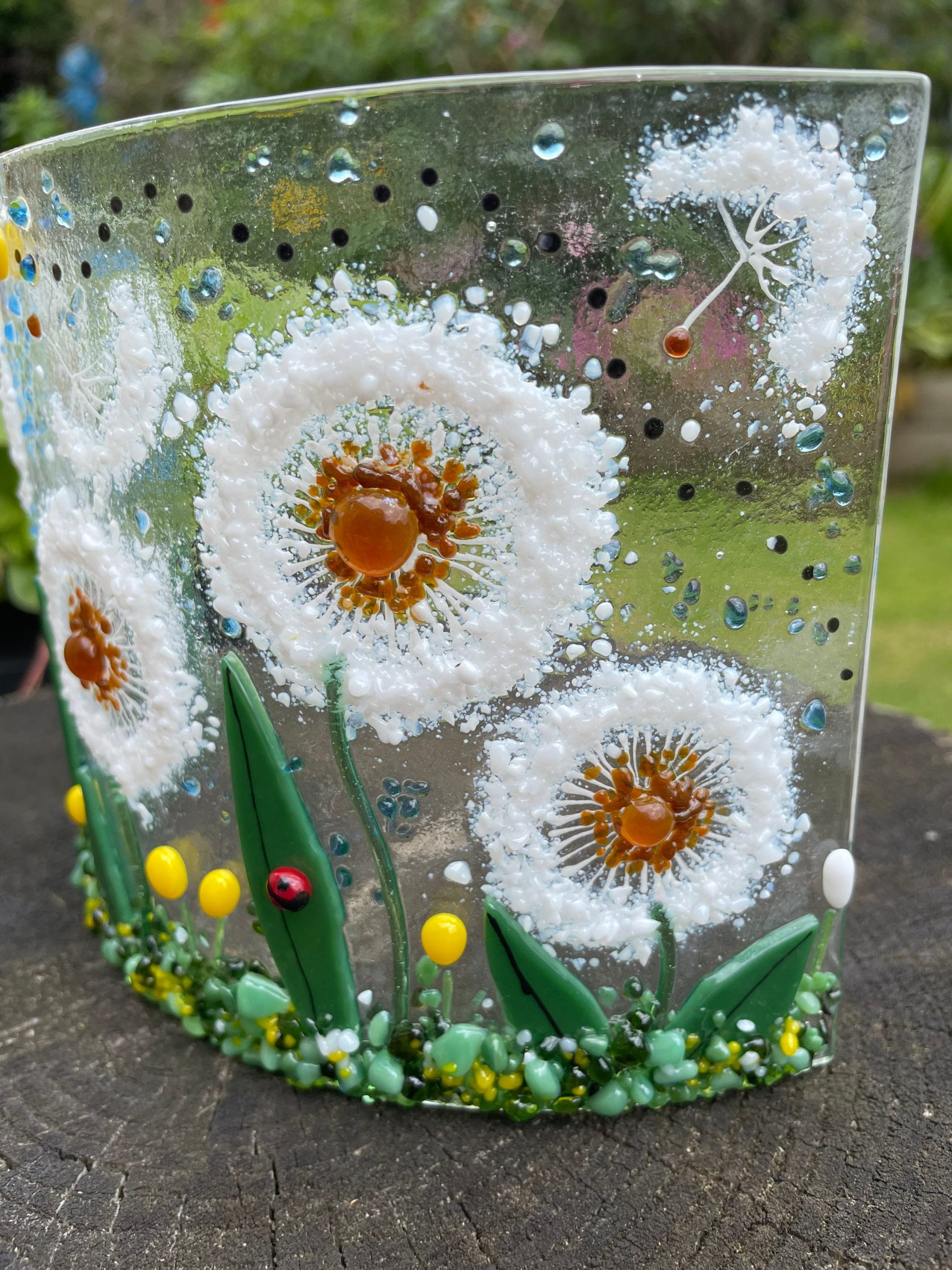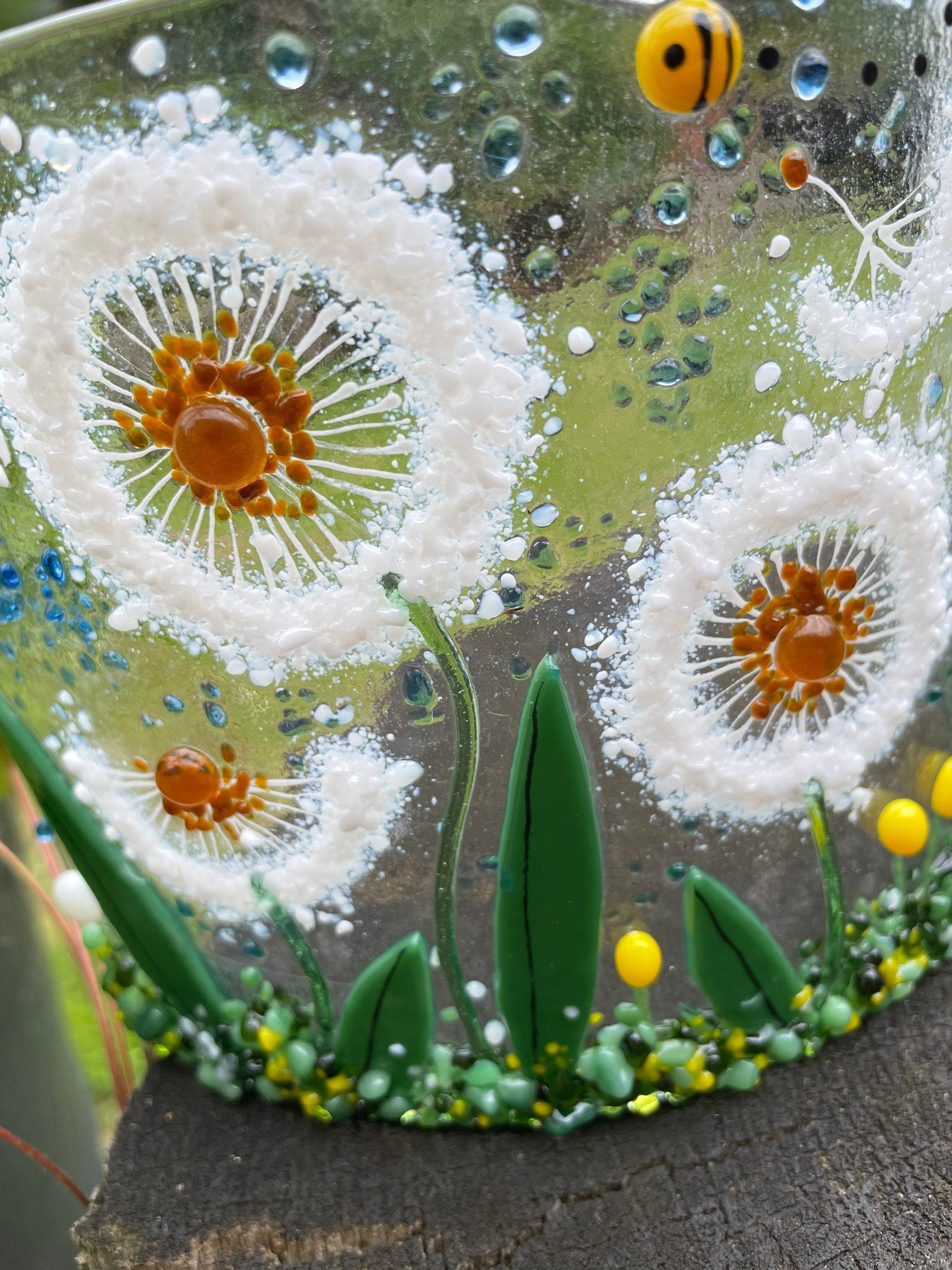 This beautiful handmade fused glass dandelion seed head wave is simple but effective. Made using glass enamel paint, glass frit and sheet glass to produce a beautiful garden scene.