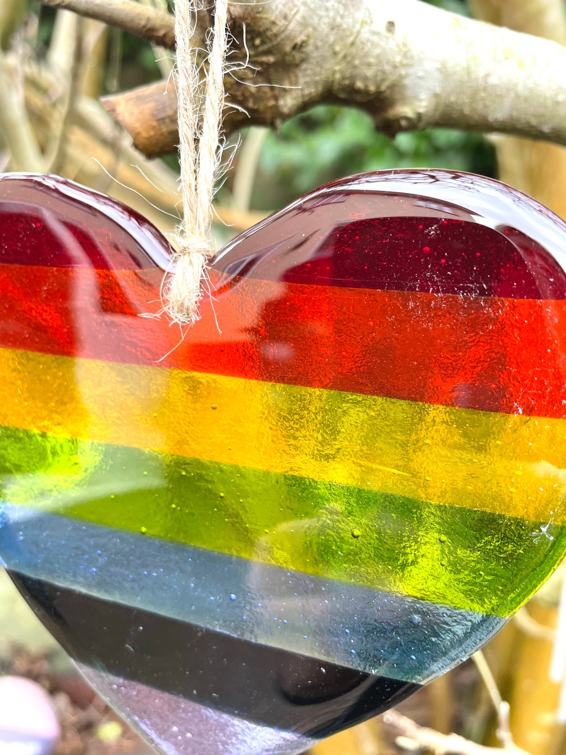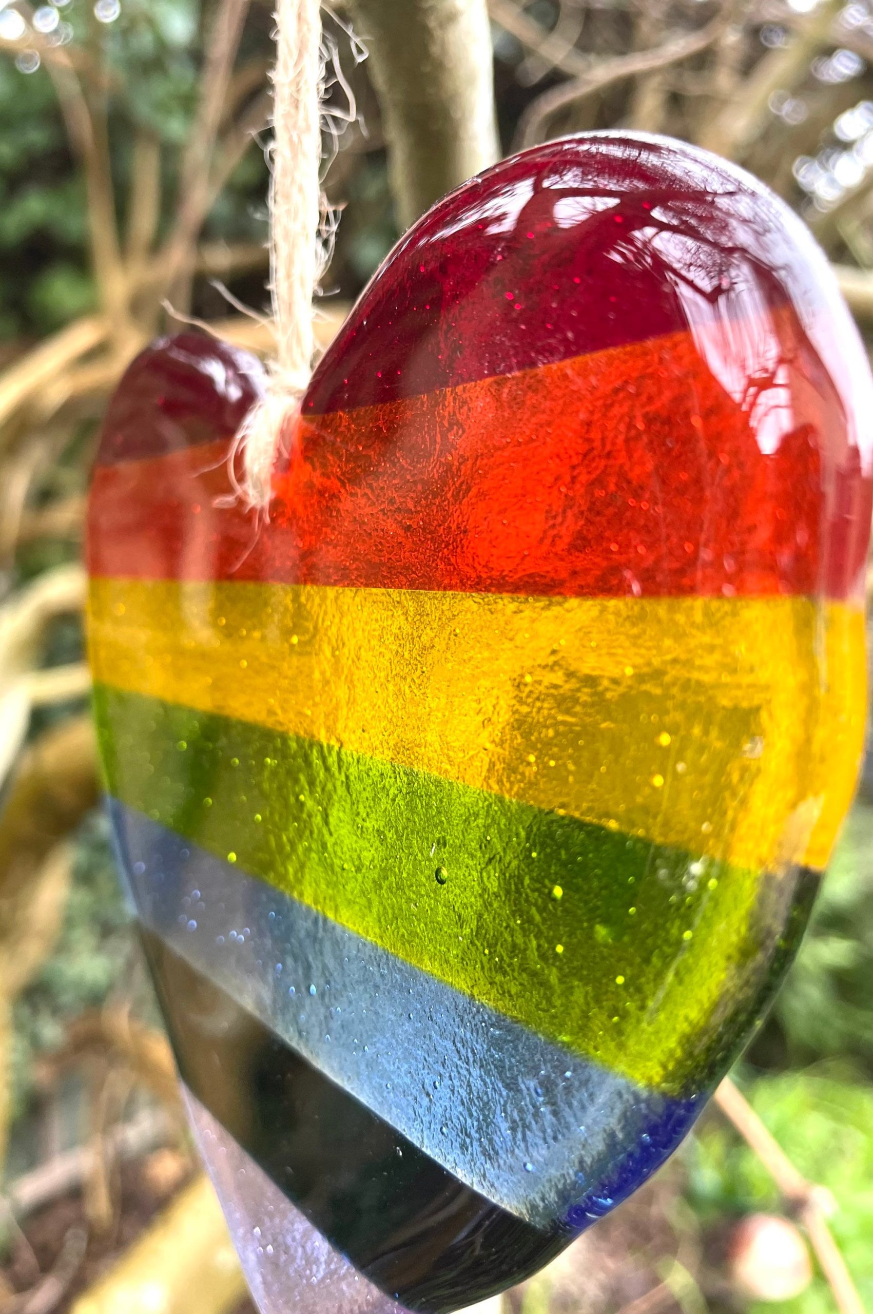 This is made with bullseye fused glass in lovely rainbow colours. All cut by hand and then fused in the kiln for approx 18 hours to leave a soft smooth finish.